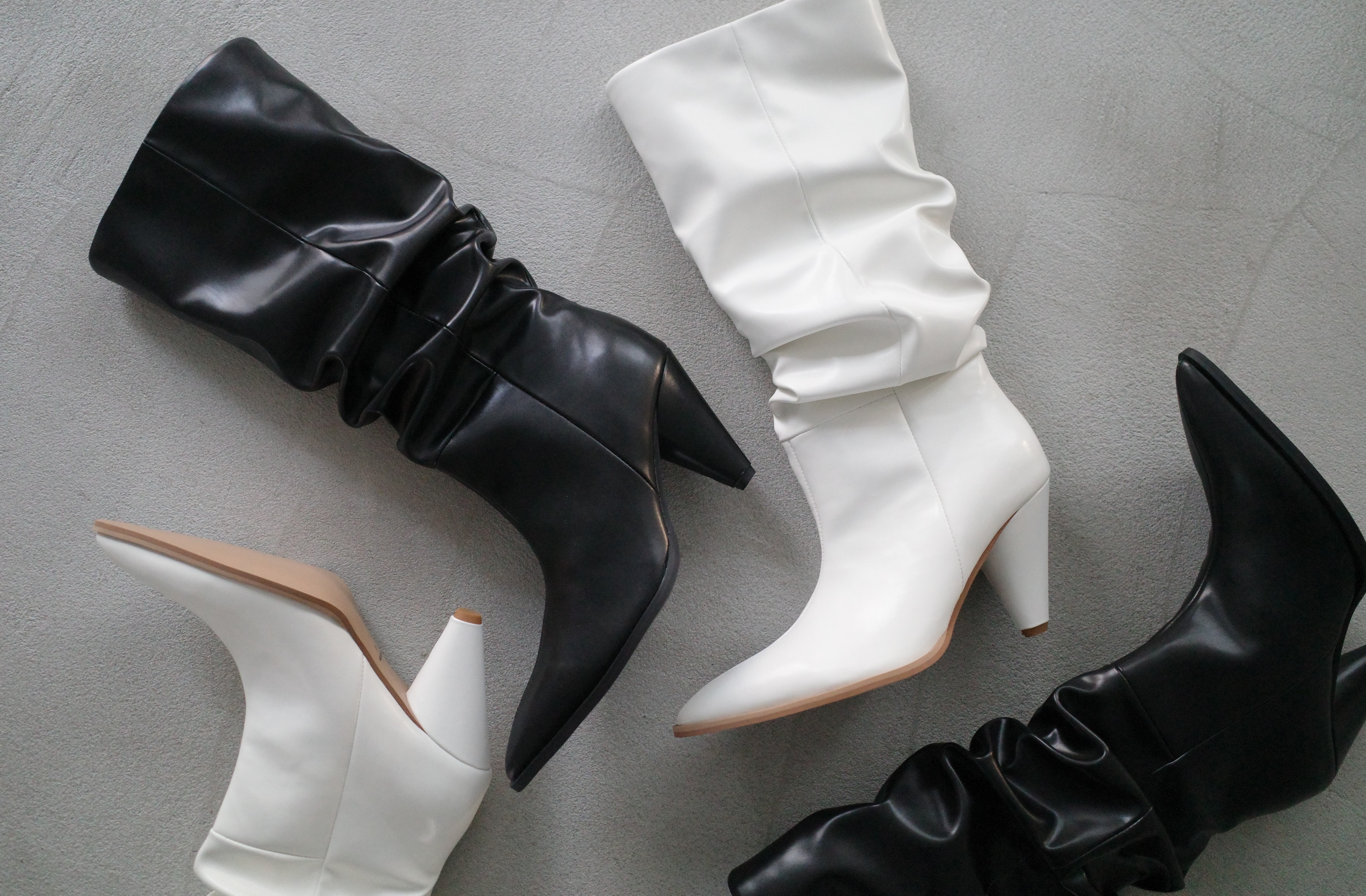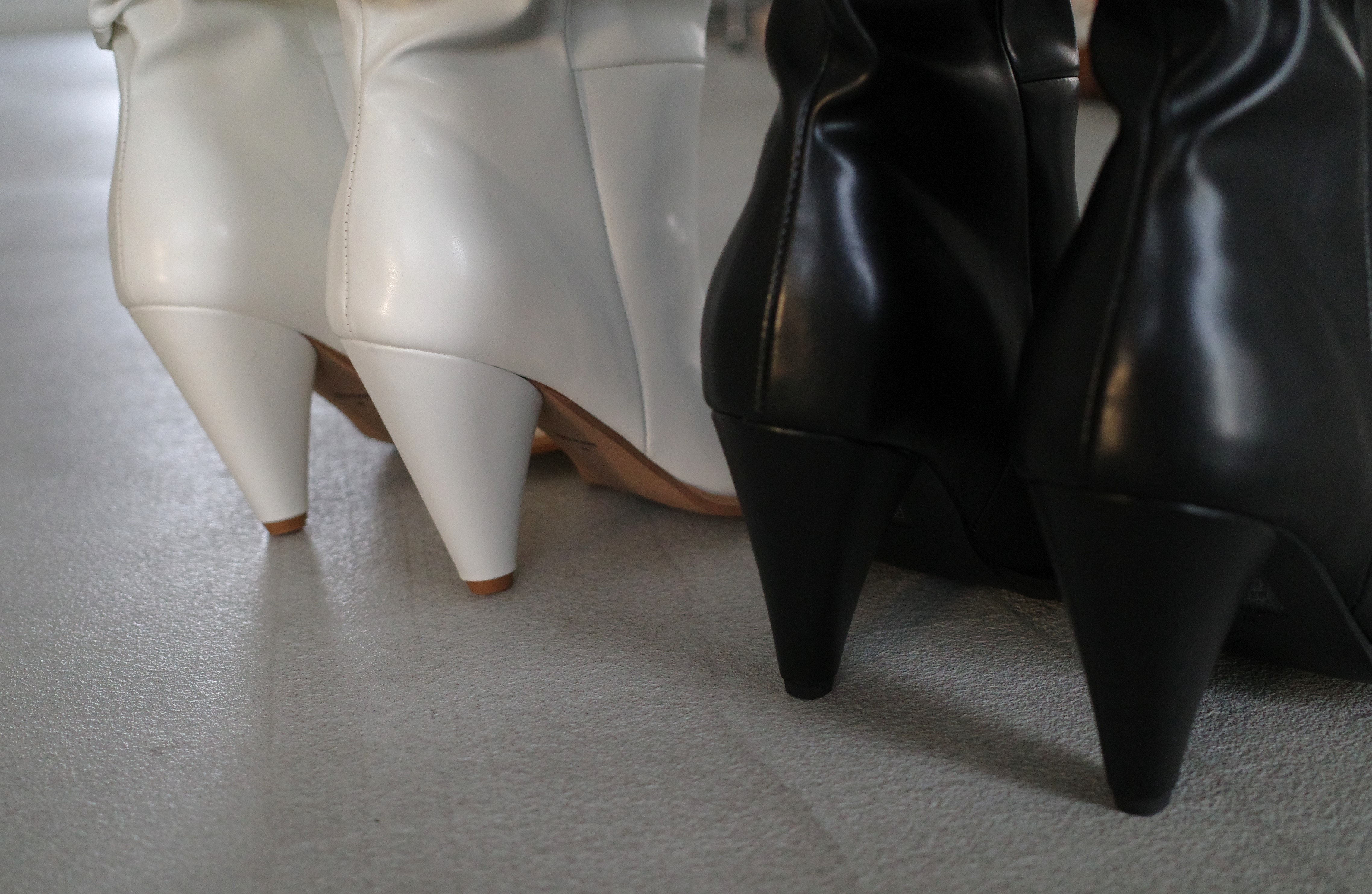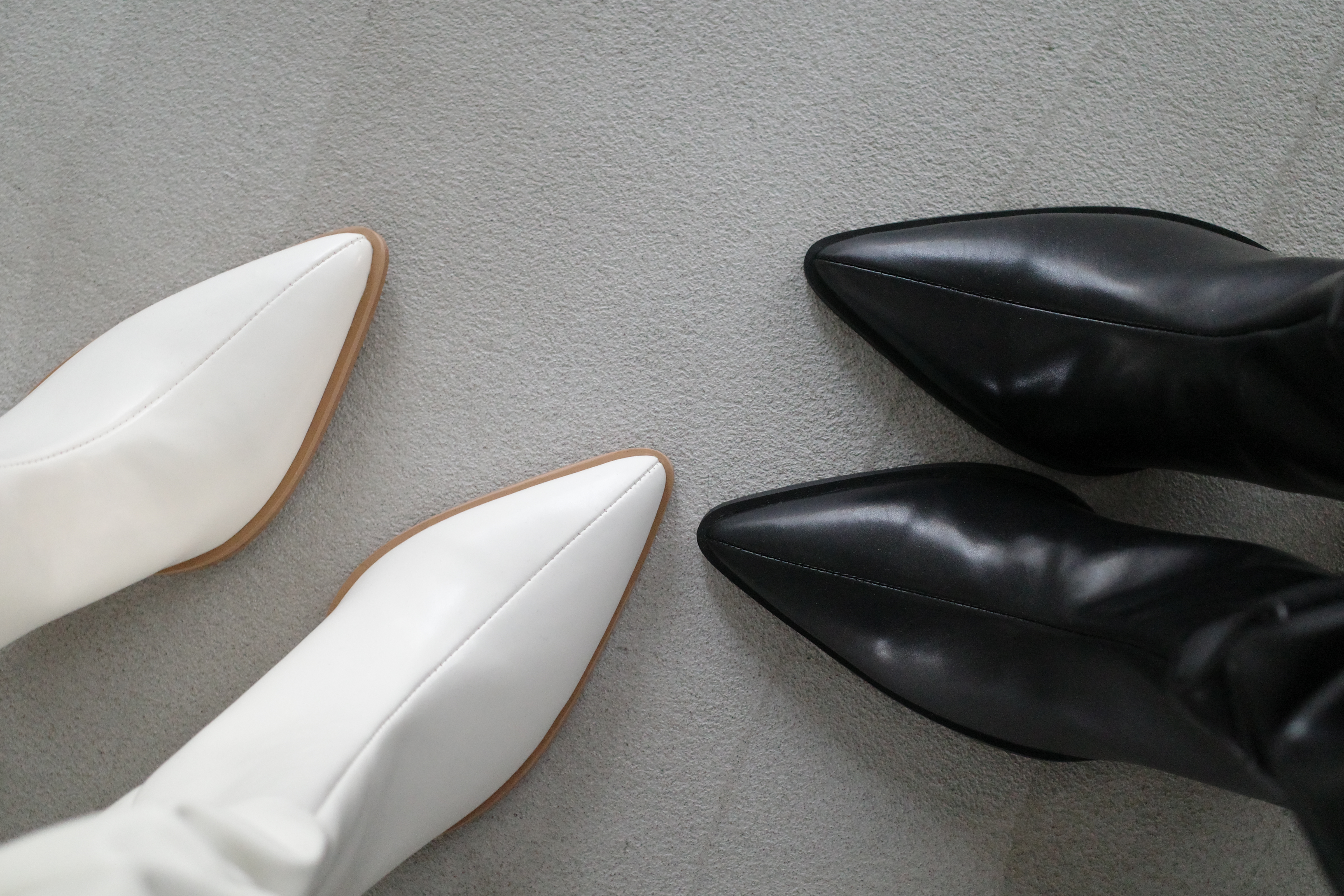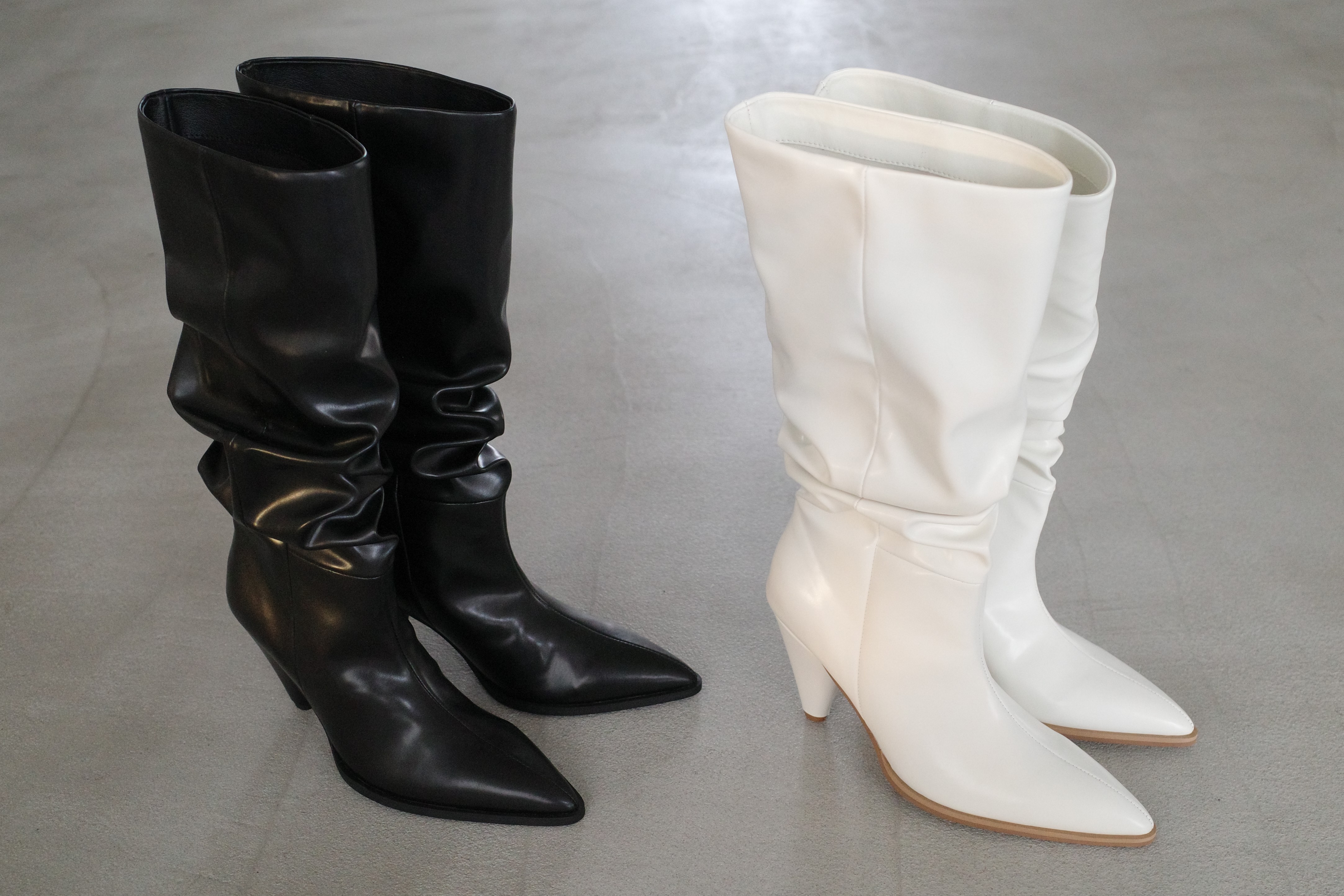 ポインテッドトゥとコーンヒールが描くシャープなラインに、たっぷりとギャザーを寄せたチャンキーなシルエットのブーツ。